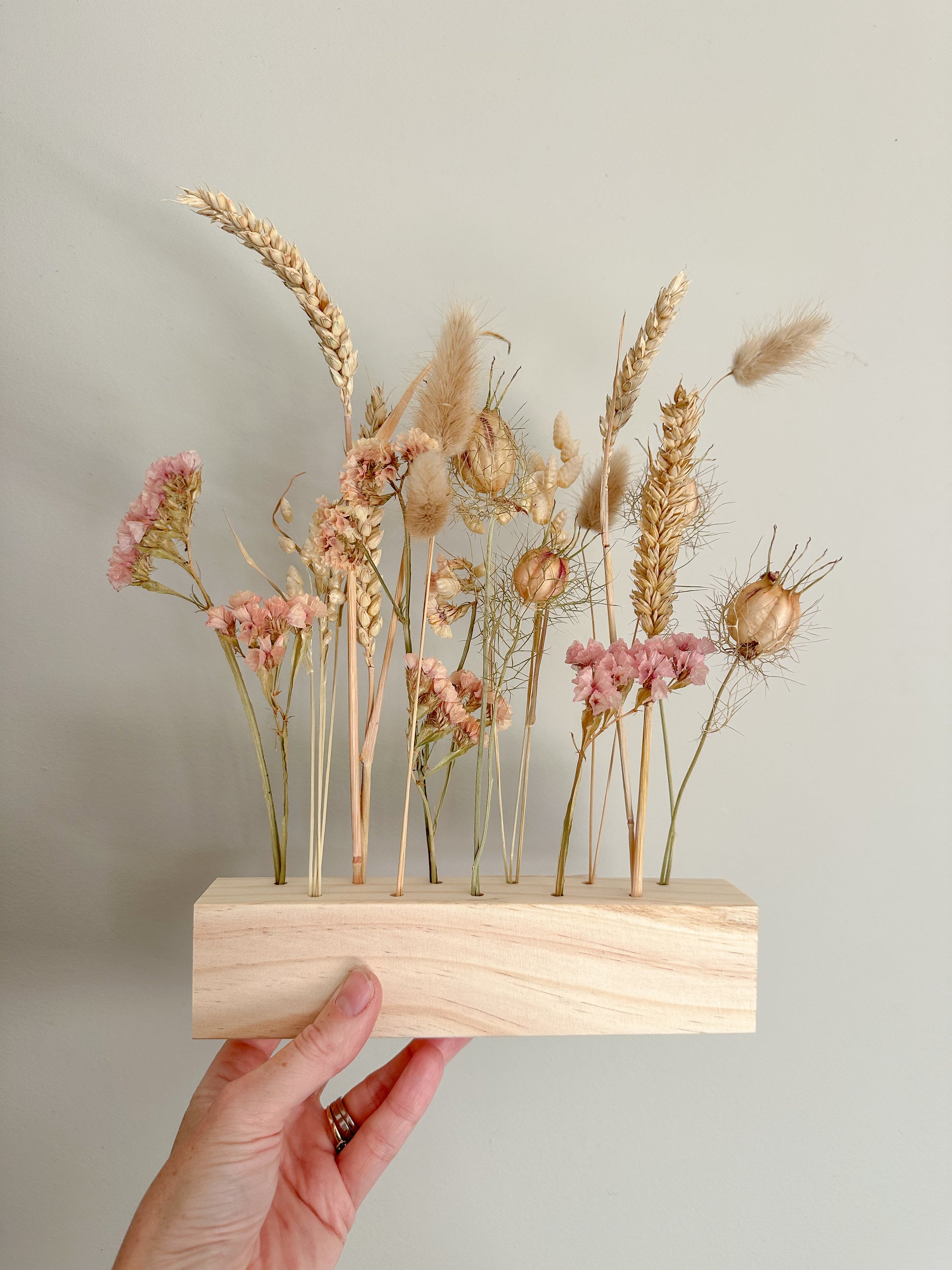 Beautiful and delicate dried flower bar made with rustic wooden bar and dried, everlasting flowers. The dried flowers include gypsophila, bunny tails, quaking grass, wheat and statice. All our dried flowers are sourced locally when possible and are of the highest quality. This classic arrangement is designed to bring a touch of nature into your home and can be displayed on windowsills, desks, mantles or used as table centre pieces.